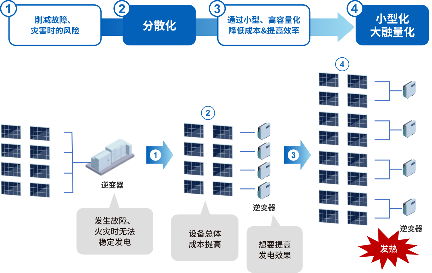 近年來,太陽能發(fā)電系統(tǒng)上的需求不斷發(fā)生變化。作為地震或水災(zāi)等災(zāi)害風(fēng)險對策,更加穩(wěn)定的電力供給需求愈發(fā)高漲,并出現(xiàn)了從集中型系統(tǒng)向分散型系統(tǒng)轉(zhuǎn)化的趨勢。并非通過1臺光伏逆變器執(zhí)行電力轉(zhuǎn)換,而是分散至多臺光伏逆變器,由此降低了發(fā)生災(zāi)害時因設(shè)備故障等所致發(fā)電停止的風(fēng)險。此外,各設(shè)備或機器上通過高容量、大電流化的配置提高了發(fā)電效率,并通過小型化、輕量化削減了設(shè)備投資,因而要求有效利用設(shè)備的呼聲愈發(fā)高漲。而另一方面,伴隨小型化、高容量化的發(fā)展,當務(wù)之急是減少設(shè)備本身產(chǎn)生的熱量,這是造成能量損失和降低設(shè)備使用壽命的一個因素。