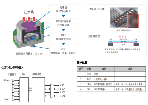 熱電堆紅外傳感器,就是利用貝塞克效應,內(nèi)部由兩個或多個熱電偶串聯(lián)組成熱電堆芯片,通過吸收物體表面的紅外輻射,當目標溫度與參考溫度存在溫度差時,熱電偶產(chǎn)生的熱電動勢互相疊加并輸出對應溫度的電壓信號。這樣,使用熱電堆測量溫度時,一來可以克服單個熱電偶產(chǎn)生的電勢差太小而難以測量的缺點,二來可以避免使用價格較高的精度運算放大器。目前市面上熱電堆傳感器主要有模擬輸出型及數(shù)字輸出型這兩種類型,模擬輸出型雖然內(nèi)部結(jié)構(gòu)簡單且價格便宜, 但電路設(shè)計時需要考慮的問題較多,除了需要搭配低溫漂的運放+高精度ADC, 還要考慮低功耗、高SNR信噪比及電路穩(wěn)定性等等,這些對研發(fā)人員來說是一項不小的挑戰(zhàn)。而歐姆龍D6T系列熱電堆紅外傳感器, 內(nèi)置ASIC+高精度運放,通過內(nèi)置MCU進行AD轉(zhuǎn)換及信號處理,可通過I2C數(shù)字接口獲取溫度數(shù)據(jù)。這樣不僅測溫電路穩(wěn)定性有保障,也大大縮短了產(chǎn)品開發(fā)周期,一定程度上也節(jié)省了開發(fā)成本。