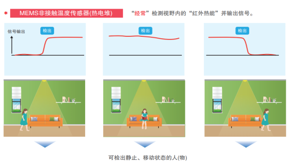 與只能檢測動態(tài)物體的熱釋電紅外傳感器,歐姆龍D6T傳感器不僅能檢測動態(tài)物體,也能檢測靜止物體,實現(xiàn)即時檢測物體的溫度變化。