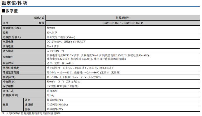 歐姆龍光電傳感器B5W-DB的光源為紅外發(fā)光二極管(850nm),受光面照度在白熾燈的情況下為3,000lx以下、太陽光的照度下為10,000lx以下。不僅如此,B5W-DB的外殼采用聚碳酸酯(PC)、透鏡部采用丙烯樹脂(PMMA)、蓋板采用聚碳酸酯(PC)材質(zhì),保護(hù)結(jié)構(gòu)符合IEC規(guī)格IP50標(biāo)準(zhǔn)(端子部除外),可幫助設(shè)備實(shí)現(xiàn)強(qiáng)耐用性。