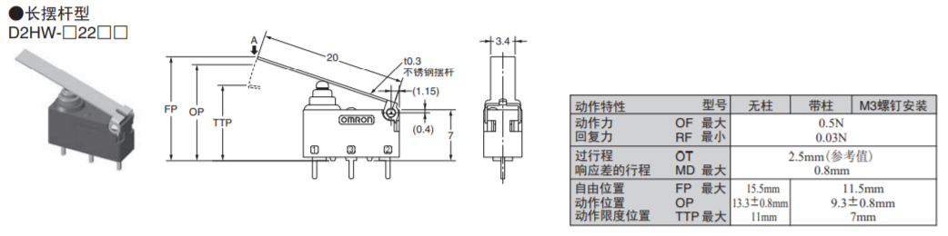 社內較小尺寸、可進行可靠開關的長行程型開關 主體部分尺寸為前代產品的78%,有利于設備的小型化。 沒有擺桿也同樣使用方便的長行程規格 (OT參考值 :1.4mm) 不含對環境有害的物質,導線類型也實現了無鉛化。