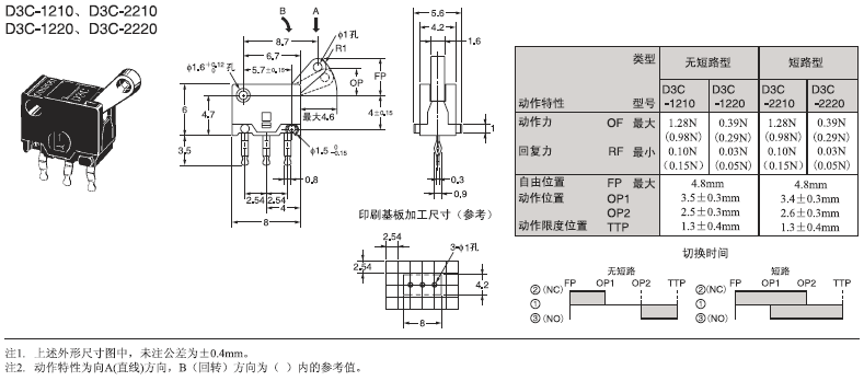 D3C 超級小型檢測開關 采用滑動式的超小型開關 超小型(高6×寬8×深4.2mm),輕量(約0.3克),3mm的長行程。 由于是滑動方式,所以短路、非短路的切換時間可根據使用用途進行選擇。